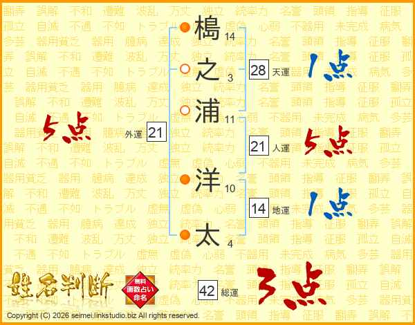 槝(14画)之(3画)浦(11画) 洋(10画)太(4画)