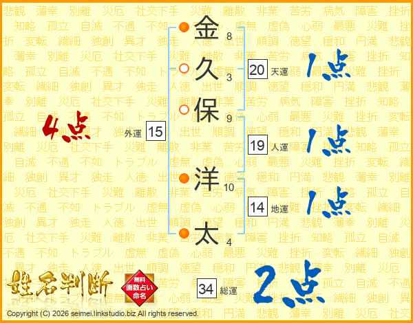 金(8画)久(3画)保(9画) 洋(10画)太(4画)