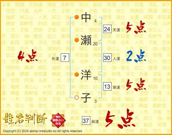 中(4画)瀬(20画) 洋(10画)子(3画)