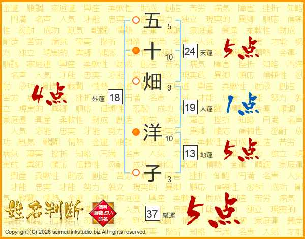 五(5画)十(10画)畑(9画) 洋(10画)子(3画)