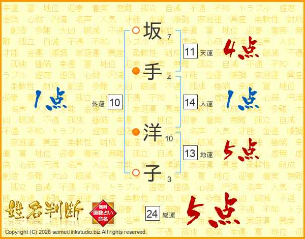 生活面を象徴する運勢です。外部から受ける影響力を表し、結婚運、家庭運や職場、環境への順応性を表します。総運から人運を引いた画数。姓や名が1文字の場合を除く。