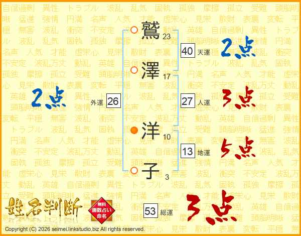 鷲(23画)澤(17画) 洋(10画)子(3画)