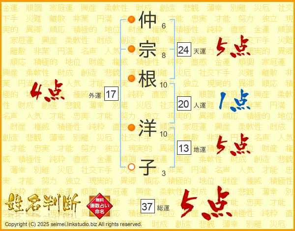 仲(6画)宗(8画)根(10画) 洋(10画)子(3画)