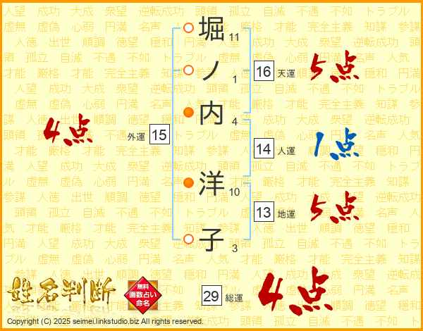 堀(11画)ノ(1画)内(4画) 洋(10画)子(3画)