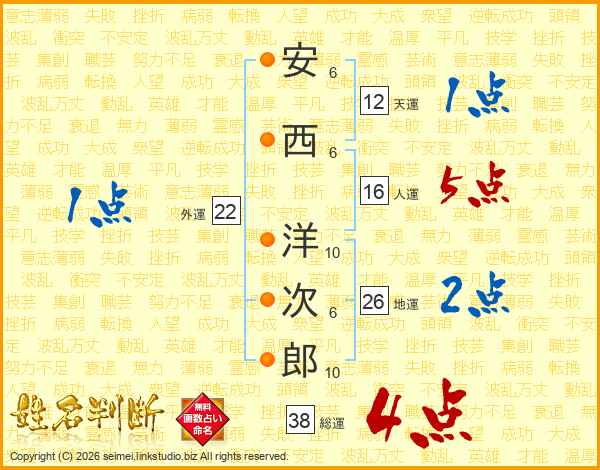 安西洋次郎さんの総運は38画の4点!