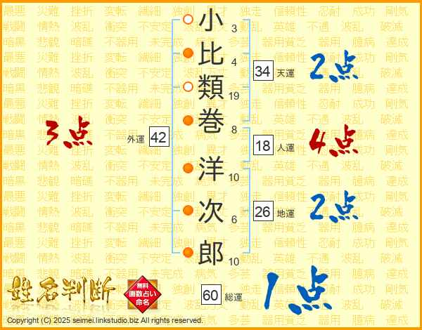 小(3画)比(4画)類(19画)巻(8画) 洋(10画)次(6画)郎(10画)