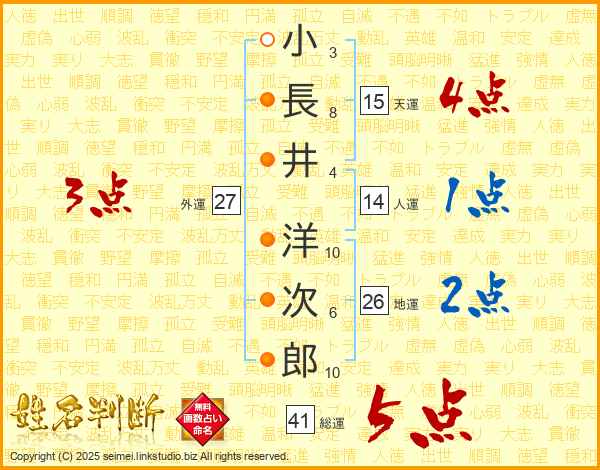 小(3画)長(8画)井(4画) 洋(10画)次(6画)郎(10画)