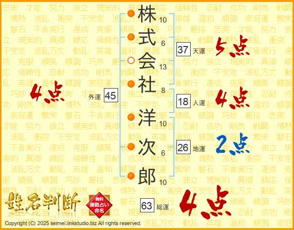 株(10画)式(6画)会(13画)社(8画) 洋(10画)次(6画)郎(10画)