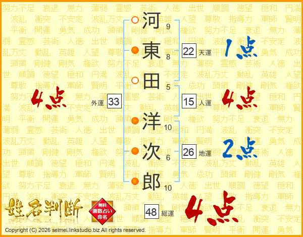 河(9画)東(8画)田(5画) 洋(10画)次(6画)郎(10画)