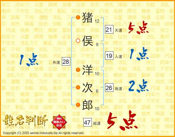 猪俣洋次郎さんの総運は47画の5点!