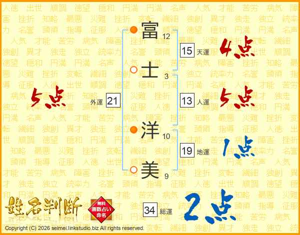 富(12画)士(3画) 洋(10画)美(9画)