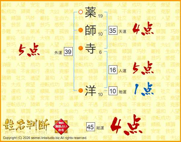 薬師寺洋さんの総運は45画の4点!