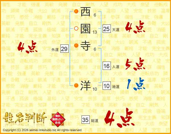 家系が持つ宿命的な運勢を表します。祖先から受け継いだ苗字ですので自分の力が及びません。家柄を象徴します。苗字の合計画数。