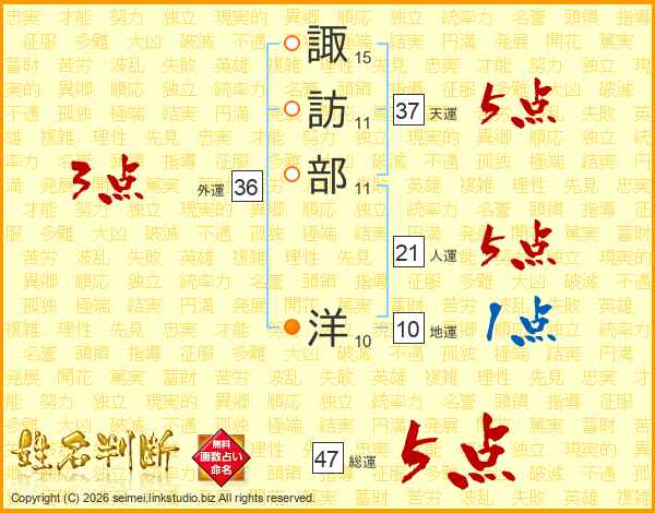 諏(15画)訪(11画)部(11画) 洋(10画)