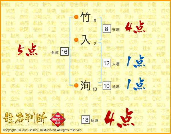 生活面を象徴する運勢です。外部から受ける影響力を表し、結婚運、家庭運や職場、環境への順応性を表します。総運から人運を引いた画数。姓や名が1文字の場合を除く。