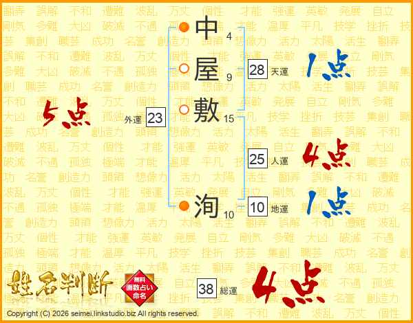中(4画)屋(9画)敷(15画) 洵(10画)