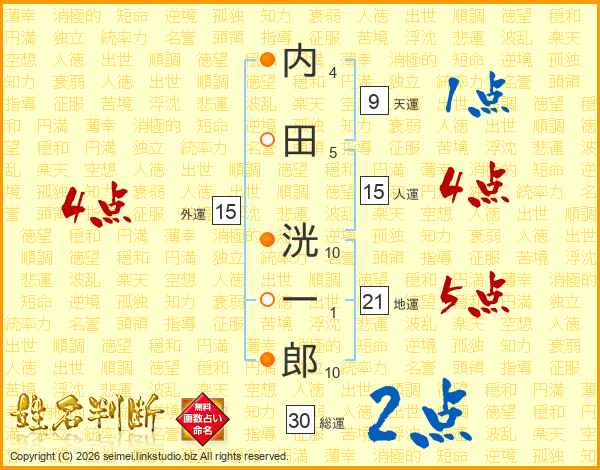 内(4画)田(5画) 洸(10画)一(1画)郎(10画)