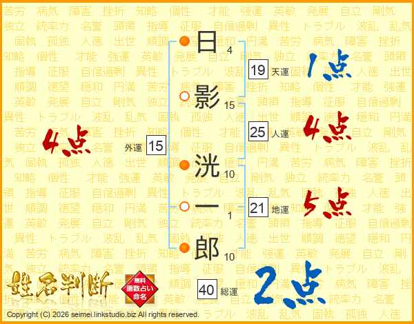日(4画)影(15画) 洸(10画)一(1画)郎(10画)