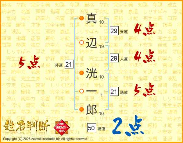 真(10画)辺(19画) 洸(10画)一(1画)郎(10画)