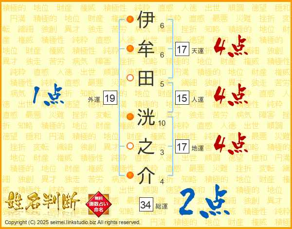 伊(6画)牟(6画)田(5画) 洸(10画)之(3画)介(4画)