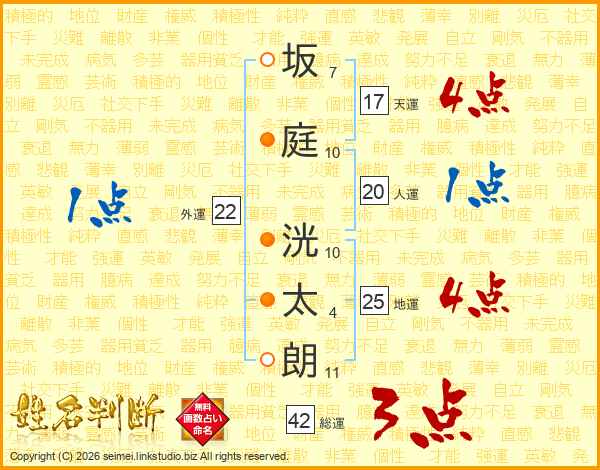 坂(7画)庭(10画) 洸(10画)太(4画)朗(11画)
