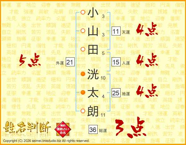小(3画)山(3画)田(5画) 洸(10画)太(4画)朗(11画)