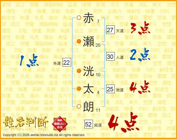 赤(7画)瀬(20画) 洸(10画)太(4画)朗(11画)