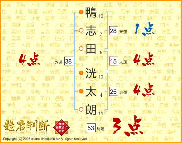 鴨(16画)志(7画)田(5画) 洸(10画)太(4画)朗(11画)