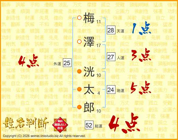 梅(11画)澤(17画) 洸(10画)太(4画)郎(10画)