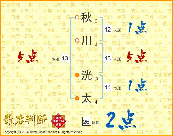 秋川洸太さんの人運は13画の5点!