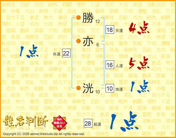 生活面を象徴する運勢です。外部から受ける影響力を表し、結婚運、家庭運や職場、環境への順応性を表します。総運から人運を引いた画数。姓や名が1文字の場合を除く。