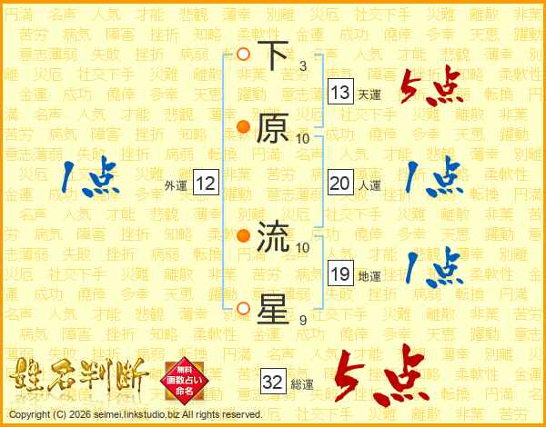 下原流星さんの総運は32画の5点!