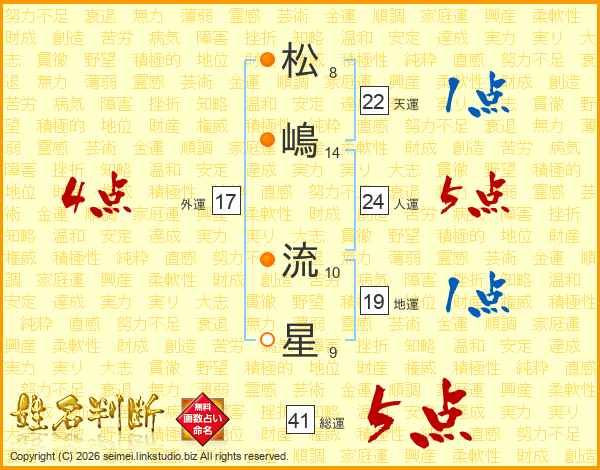 松嶋流星さんの総運は41画の5点!