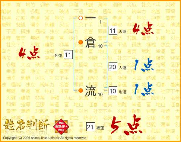 一倉流さんの総運は21画の5点!