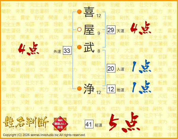 喜(12画)屋(9画)武(8画) 浄(12画)