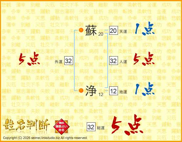 生活面を象徴する運勢です。外部から受ける影響力を表し、結婚運、家庭運や職場、環境への順応性を表します。総運から人運を引いた画数。姓や名が1文字の場合を除く。