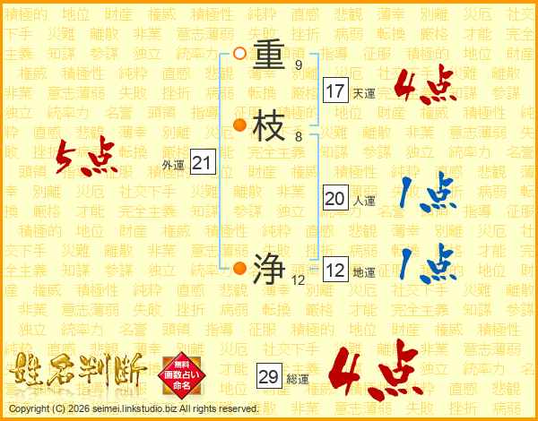 重枝浄さんの総運は29画の4点!