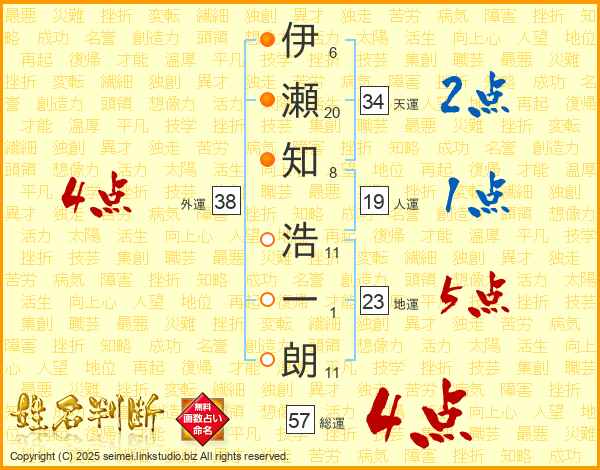 伊(6画)瀬(20画)知(8画) 浩(11画)一(1画)朗(11画)