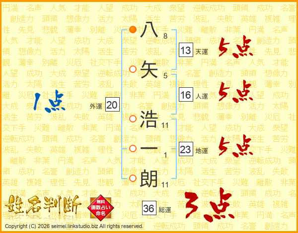 八(8画)矢(5画) 浩(11画)一(1画)朗(11画)