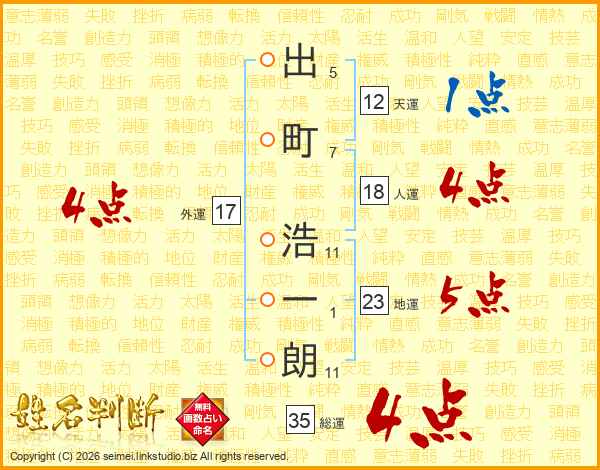 出(5画)町(7画) 浩(11画)一(1画)朗(11画)