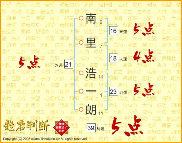 南(9画)里(7画) 浩(11画)一(1画)朗(11画)