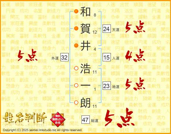 和(8画)賀(12画)井(4画) 浩(11画)一(1画)朗(11画)