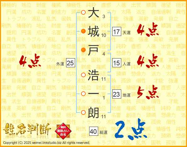 大(3画)城(10画)戸(4画) 浩(11画)一(1画)朗(11画)
