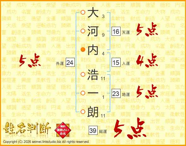 大(3画)河(9画)内(4画) 浩(11画)一(1画)朗(11画)
