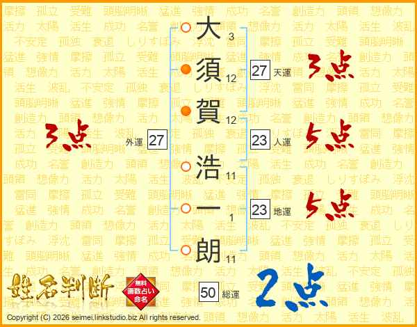 大(3画)須(12画)賀(12画) 浩(11画)一(1画)朗(11画)