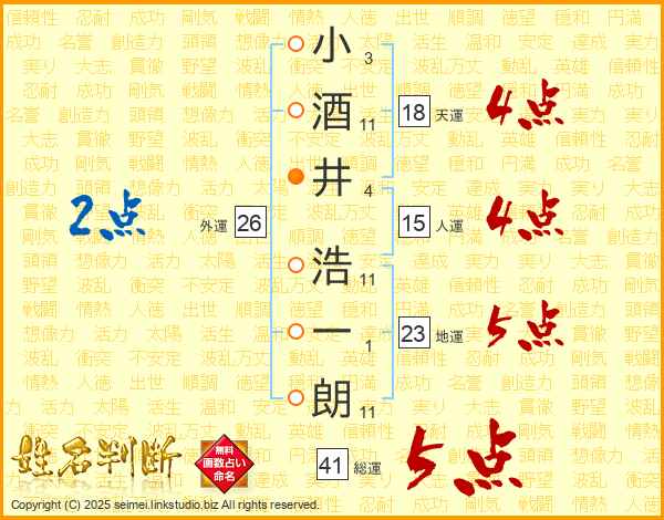 小(3画)酒(11画)井(4画) 浩(11画)一(1画)朗(11画)