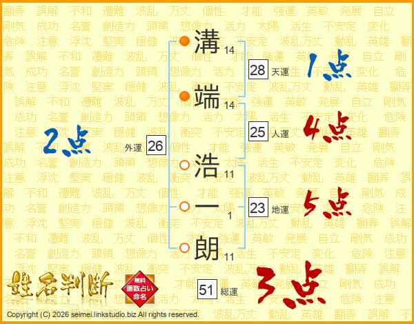 溝(14画)端(14画) 浩(11画)一(1画)朗(11画)