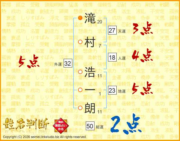 滝(20画)村(7画) 浩(11画)一(1画)朗(11画)