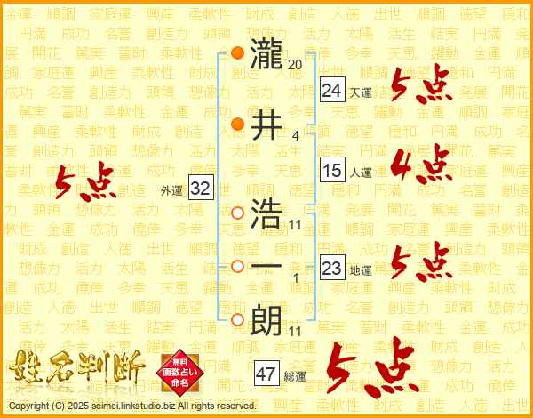 瀧(20画)井(4画) 浩(11画)一(1画)朗(11画)