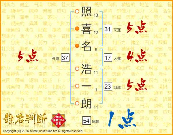 照(13画)喜(12画)名(6画) 浩(11画)一(1画)朗(11画)